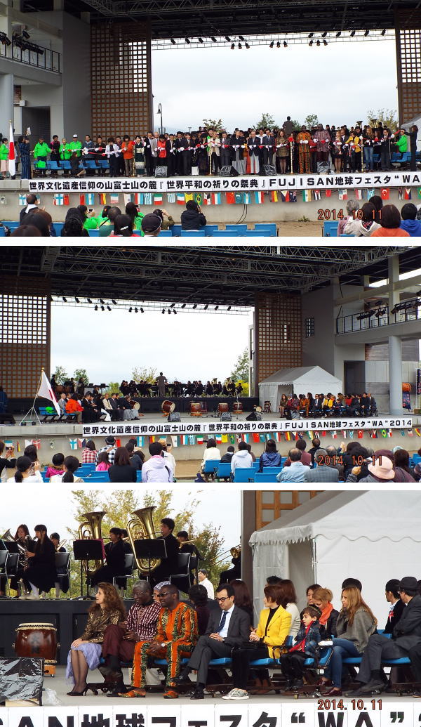 平成26年10月11日~13日、山梨県の山中湖交流プラザきららにおいて、FUJISAN地球フェスタ“WA”2014が開催されました。これは、国境を超えた伝統文化(衣食住、芸術、武芸)の交流を通して、〝WA”(和・環・輪)をつなぎ、世界平和への祈りを捧げ、日本人の精神と伝統的な生き方を残したいという願いを込めたフェスタです。オープンセレモニーでは、世界6か国の大使とのテープカットがあり、大勢の方が参加しました。